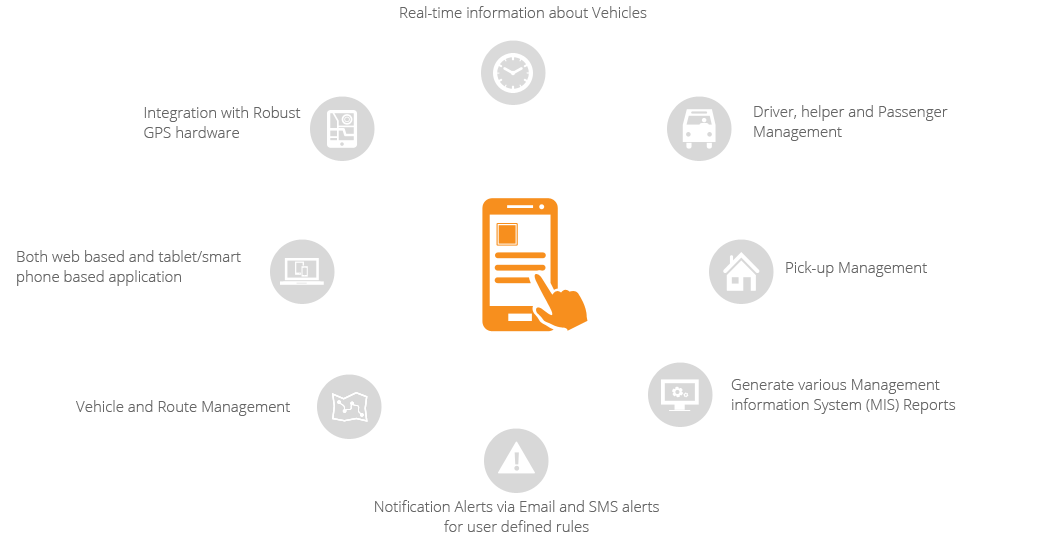 Notifications to managers and users when the vehicles leaves and reaches the destination and when the vehicle arrives at the drop point and the pickup point.